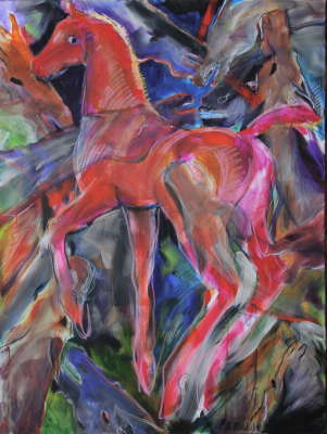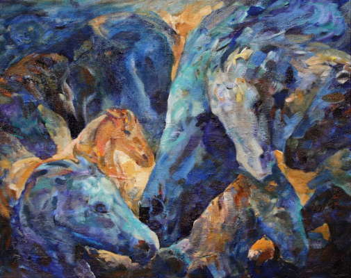 Love of horses and an intuitive understanding of their characters inspired her to draw and paint horses from early childhood. Her artistic expression over the years evolved from photo realistic portraits of the horse's physical beauty toward more abstract equine paintings that better captured their real essence and spirit. The deep understanding of their anatomy and their herd relationships that came from riding dressage and eventing add an intimacy to all her work.